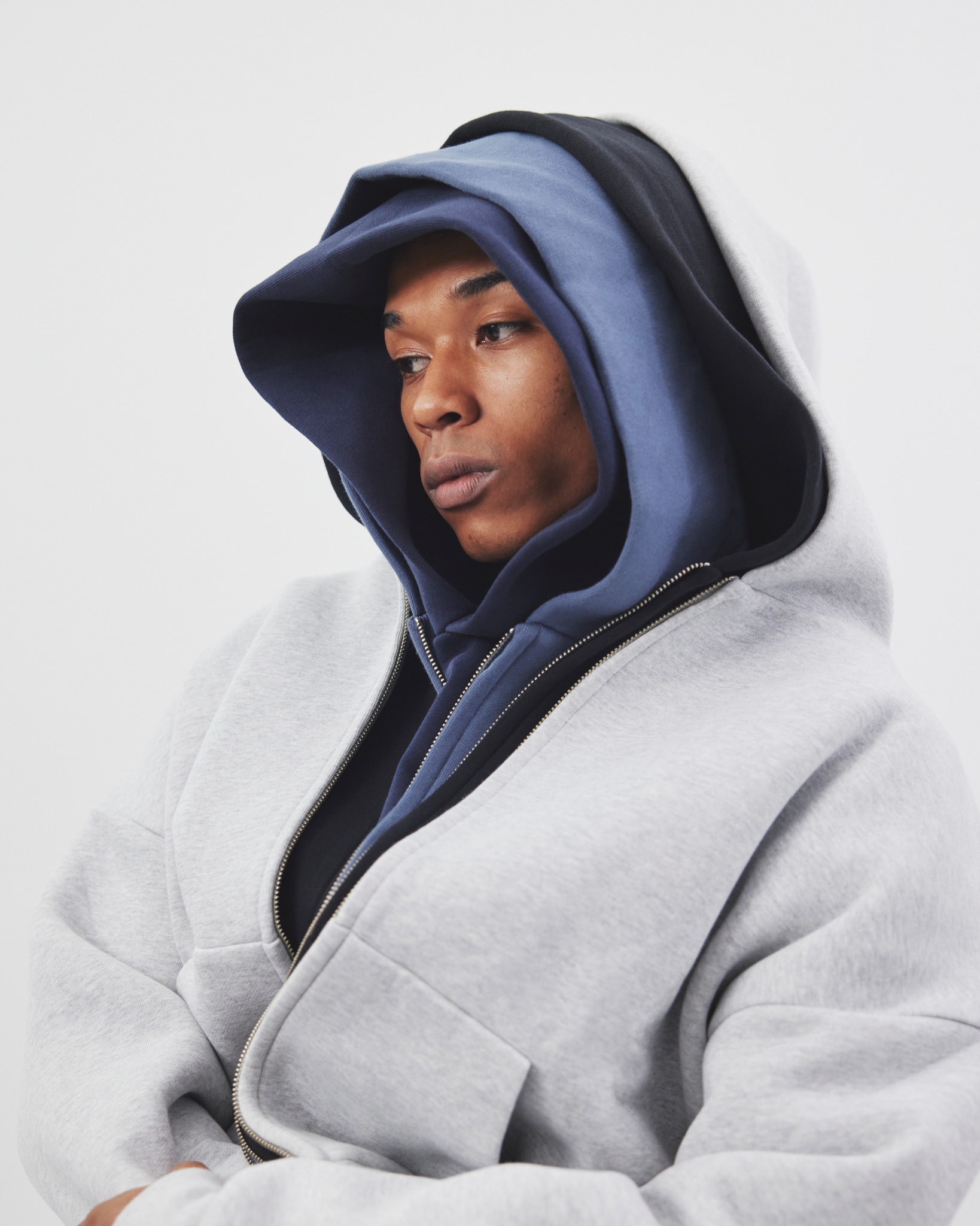 ハリ感のある素材が生む立体的なフードと構築的なフォルムが特徴だ。