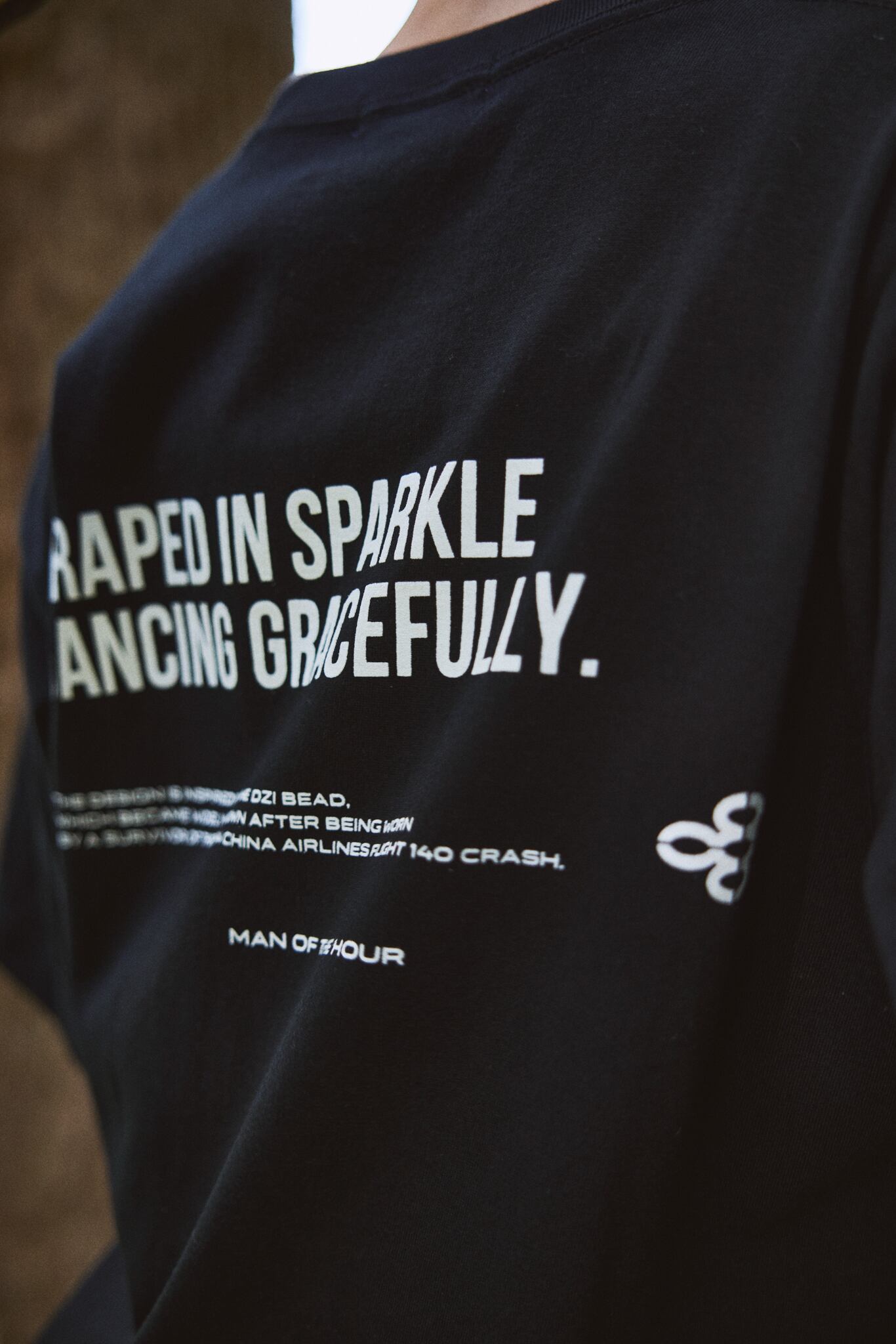 6.2オンスの肉厚なボディに、今季のテーマ「Draped in sparkle, dancing gracefully.」をシルクスクリーンで大胆に表現した一枚。フロントにはブランドの象徴である“tenju”ロゴとシンボルマークを配置。通常の日本サイズで設計され、程よいフィット感と存在感を兼ね備えたスタンダードなTシャツです。